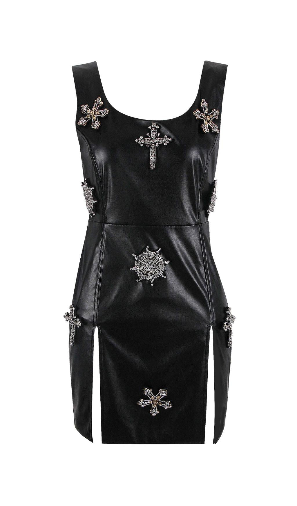 Get ready to turn heads with our Crystal Leather Mini Dress in Black. Made from high-quality crystal leather material. this dress exudes luxury and style. Whether you're going on a romantic dinner date. having champagne with the girls. or hitting the cocktail bars and party nights. this dress is the perfect choice.