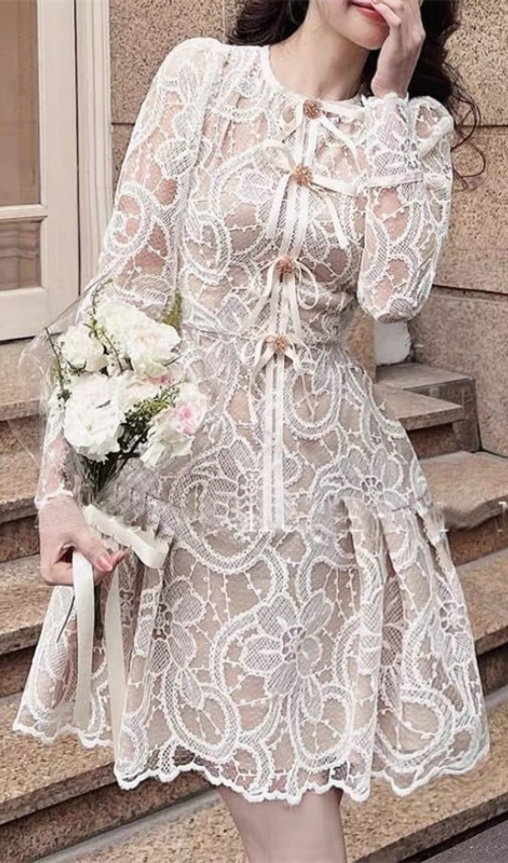 The delicate lace and bow detailing add a touch of elegance to this modern and chic dress. perfect for any special occasion. The diamond buttons add a subtle yet eye-catching detail. making this dress a must-have in your wardrobe.