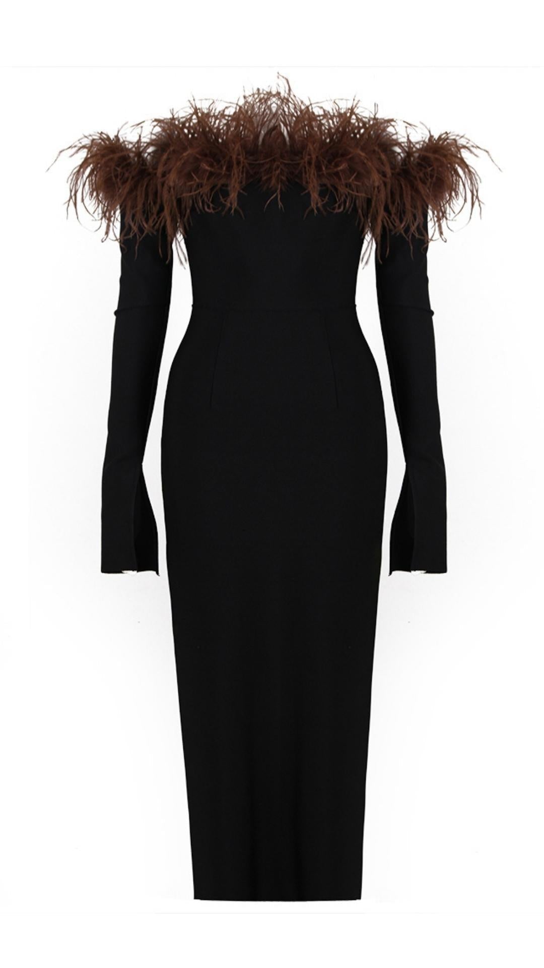 The Feather Off the Shoulder Midi Dress is the epitome of chic. With its incredible plumage and perfectly fitted waist and under-breast line. this dress is designed to show off your curves in the most flattering way. The off the shoulder neckline adds a touch of glamour. while the midi length adds an elegant and sophisticated touch.