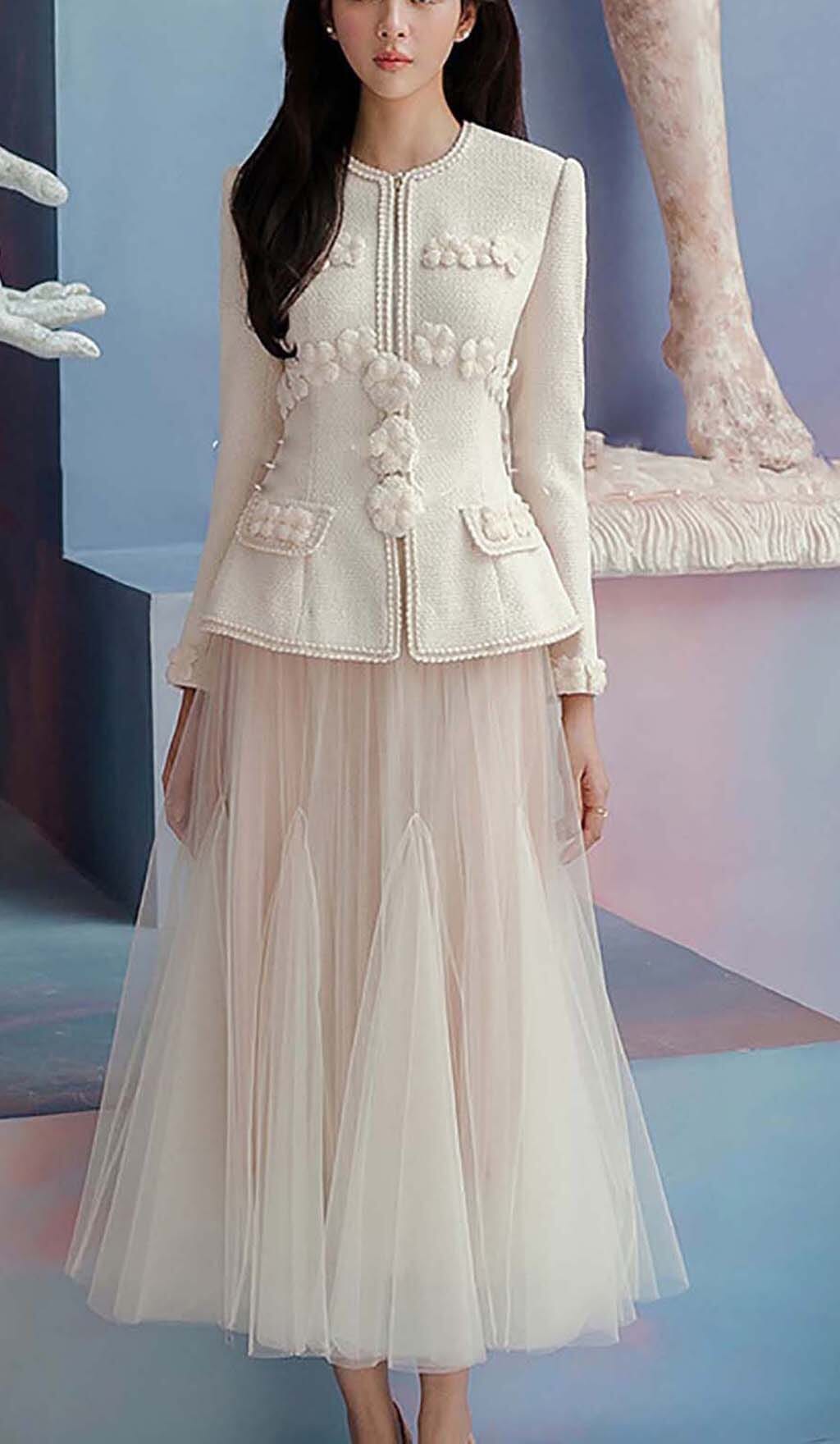 Bloom in Boho Beauty With This Floral Embellished Draped Two Piece Set in cream. The Jacket Features a Sparkling Floral Embellishment While the High Waist Maxi Skirt Boasts Elegant Draping. Create a Free-Spirited Festival. Vacation. or Honeymoon Look by Pairing This Set With Rustic Wedges and Layered Jewelry.