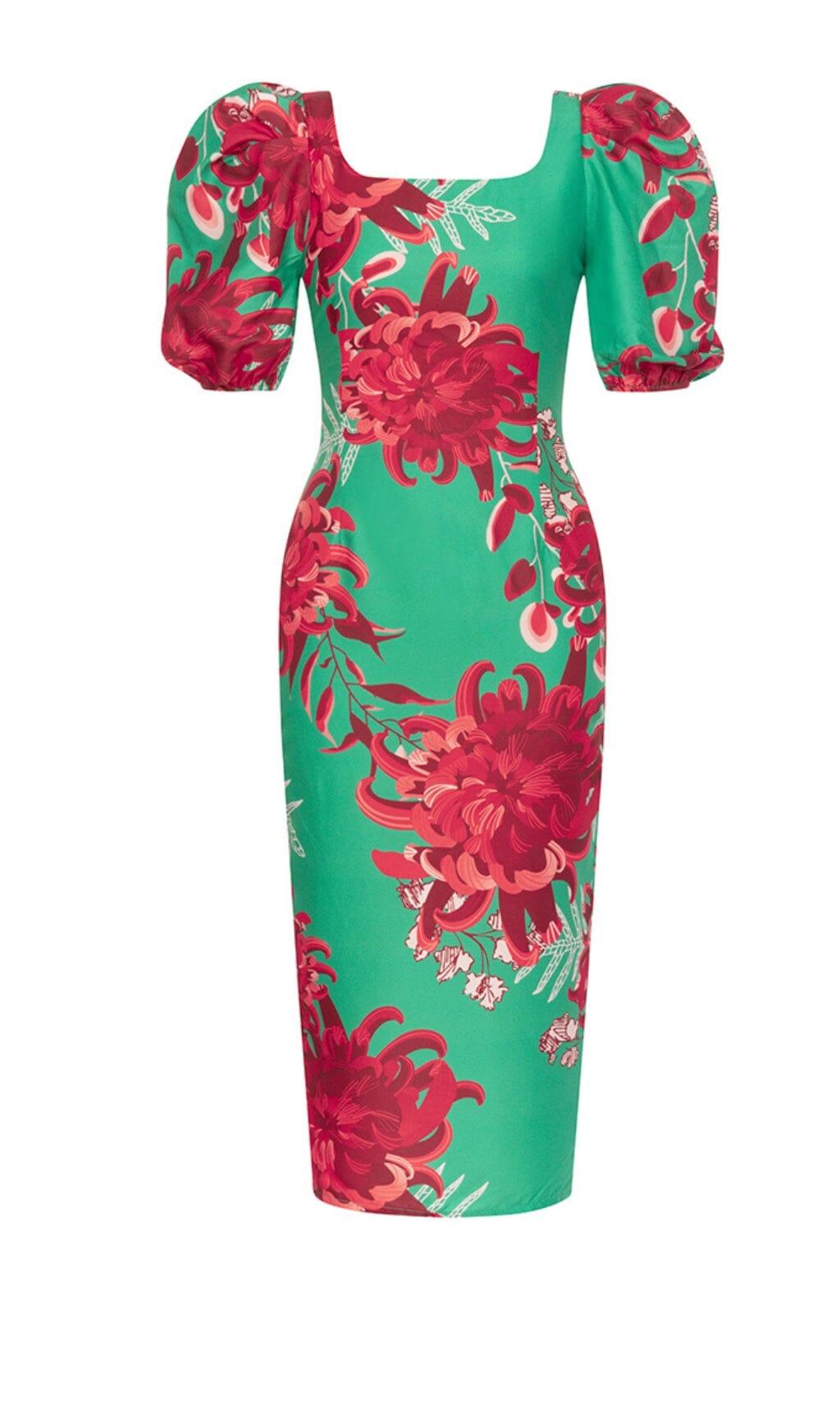 Elevate your style and make a statement with our Floral Print Puff Sleeved Open Back Midi Dress in Green. Order now and embrace your unique sense of fashion.