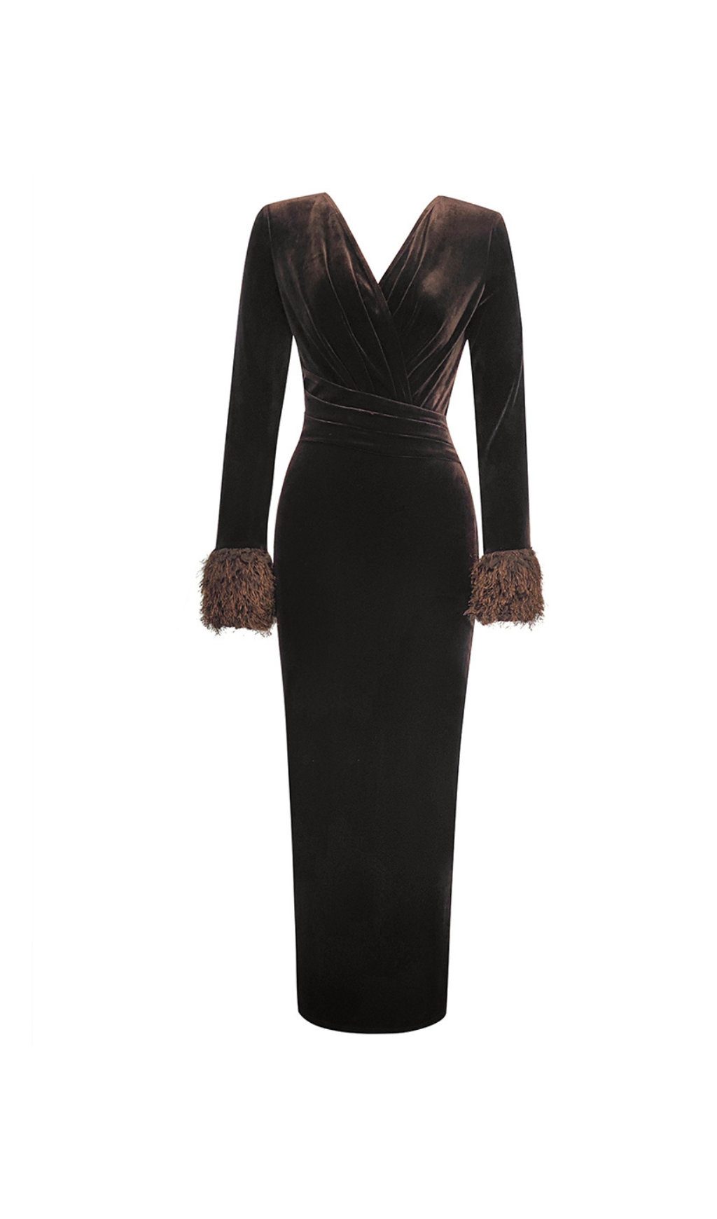 This stunning dress features a soft and plush velvet material. with flowing maxi length and delicate feather accents on the sleeves. Perfect for any special occasion. this dress will make you stand out in style and comfort. Elevate your wardrobe today!