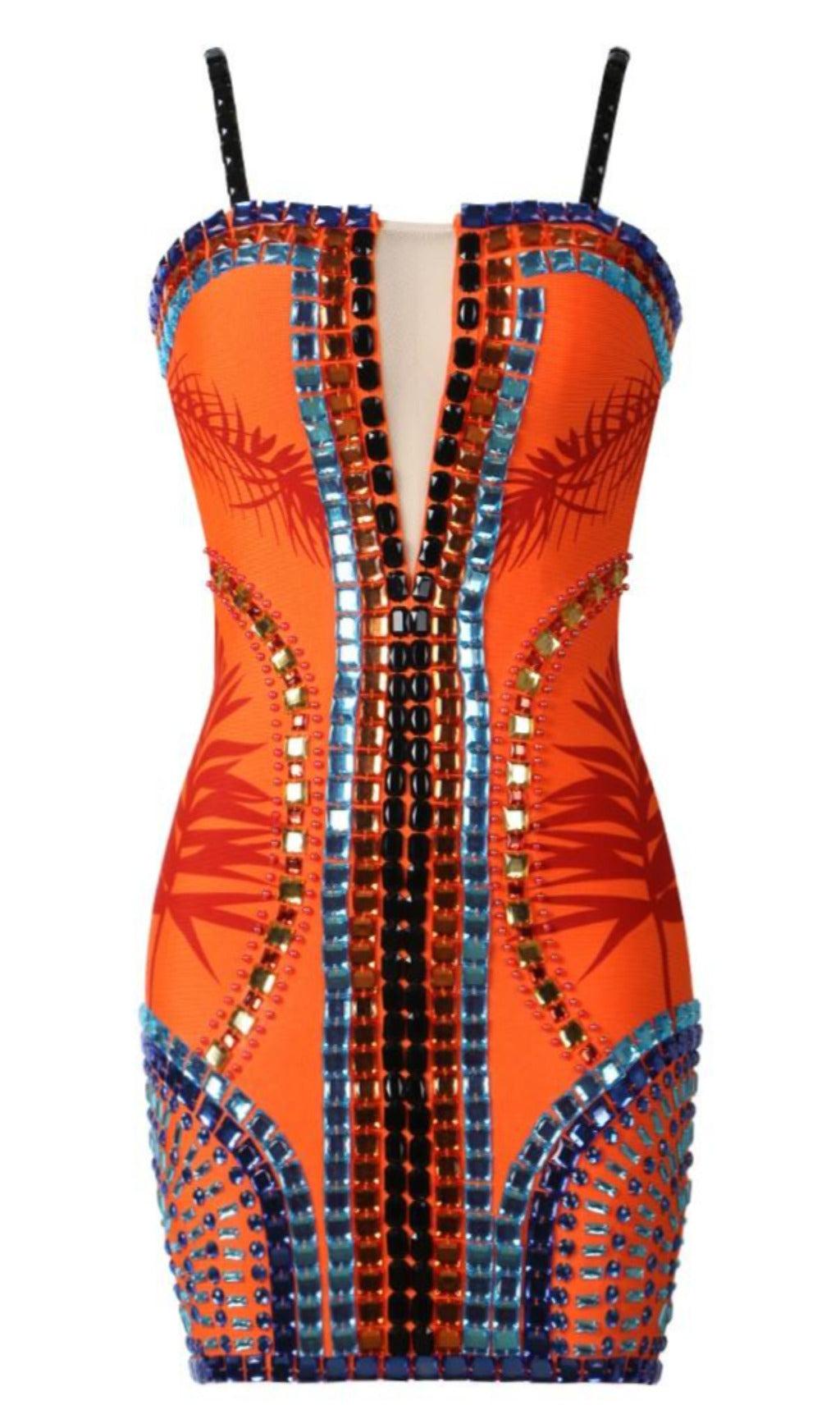 Navigate the night in a dress that really packs a punch. The Orange Embellished Bandage Dress is worked in colorful jewelry embellished overlay. For those after-dark cocktail invites. style with sleek waves. transparent heels. and diamante earrings. and you'll be the star of the show from the bar to the dance floor.