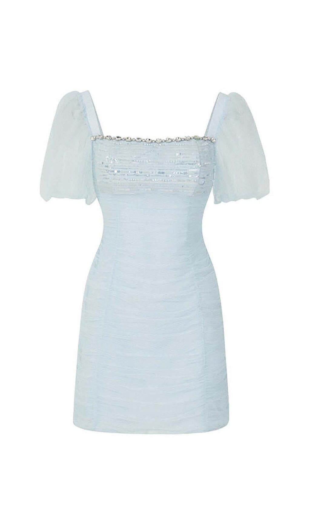 Elevate your wardrobe with our Puff Sleeve Perspective Mini Dress in Sky Blue. Its unique design and attention to detail set it apart from the rest. Order now and make a bold fashion statement!